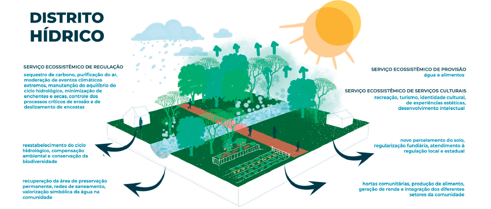 Para desenvolver a proposta, o projeto de extensão aplicou esses princípios no Núcleo Barra, para o qual detalhou-se as ações para a constituição do distrito hídrico, uma vizinhança orientada aos serviços ecossistêmicos que garante segurança hídrica e alimentar no núcleo e na própria região metropolitana, considerando os efeitos sistêmicos. A proposta do projeto é a aplicação desses princípios em várias escalas: no município, na RMSP e no Estado de São Paulo, conduzindo para um alinhamento entre as políticas ambientais, urbanísticas e habitacionais.