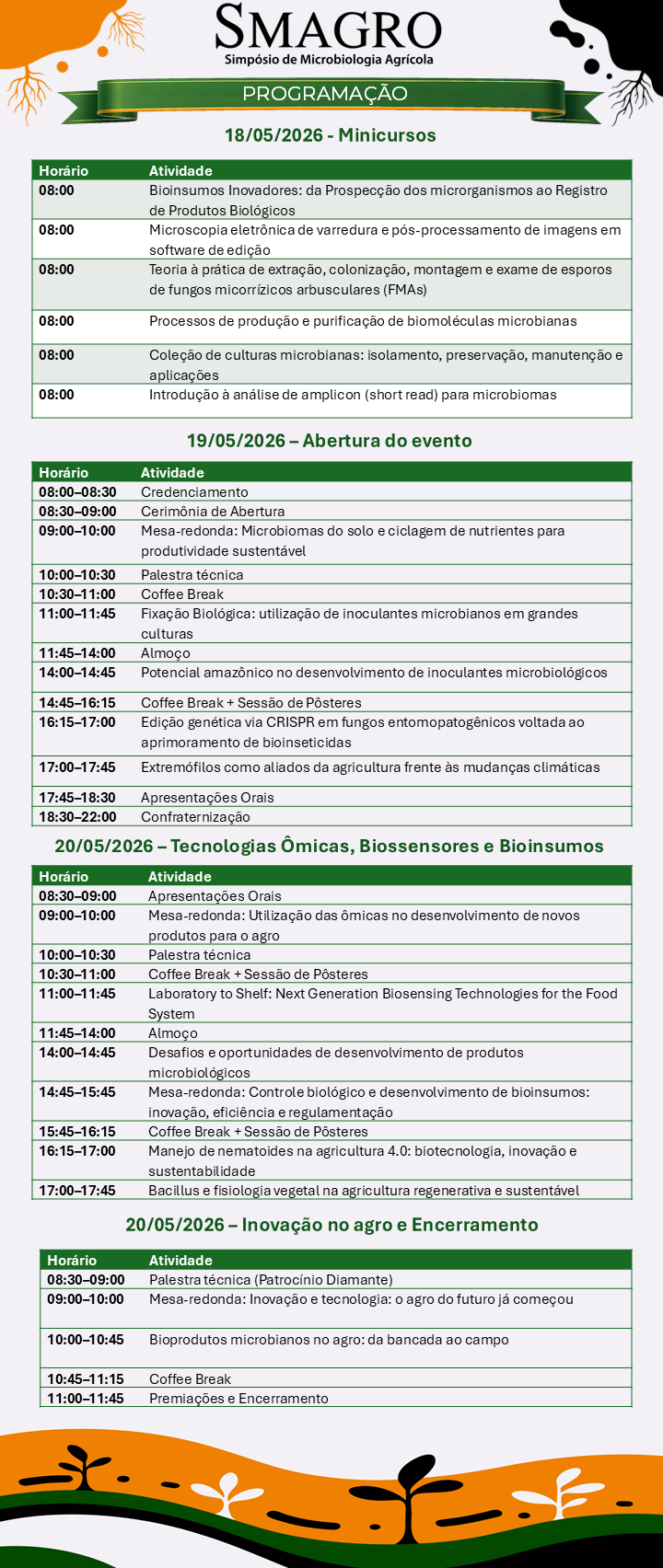 A programação do VII SMAGRO 2026 está sujeita a alterações. Ajustes de horários, atividades e palestrantes podem ocorrer conforme a confirmação de participantes e necessidades operacionais do evento. Os detalhes e atualizações serão disponibilizados gradualmente, e todas as novidades serão publicadas no Instagram oficial do evento ao longo do período de preparação.